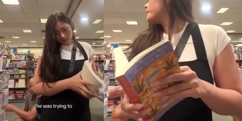 A woman recording a video for her TikTok account caught a creepy man lurking behind her and acting bizarrely while he perused a book store in California.